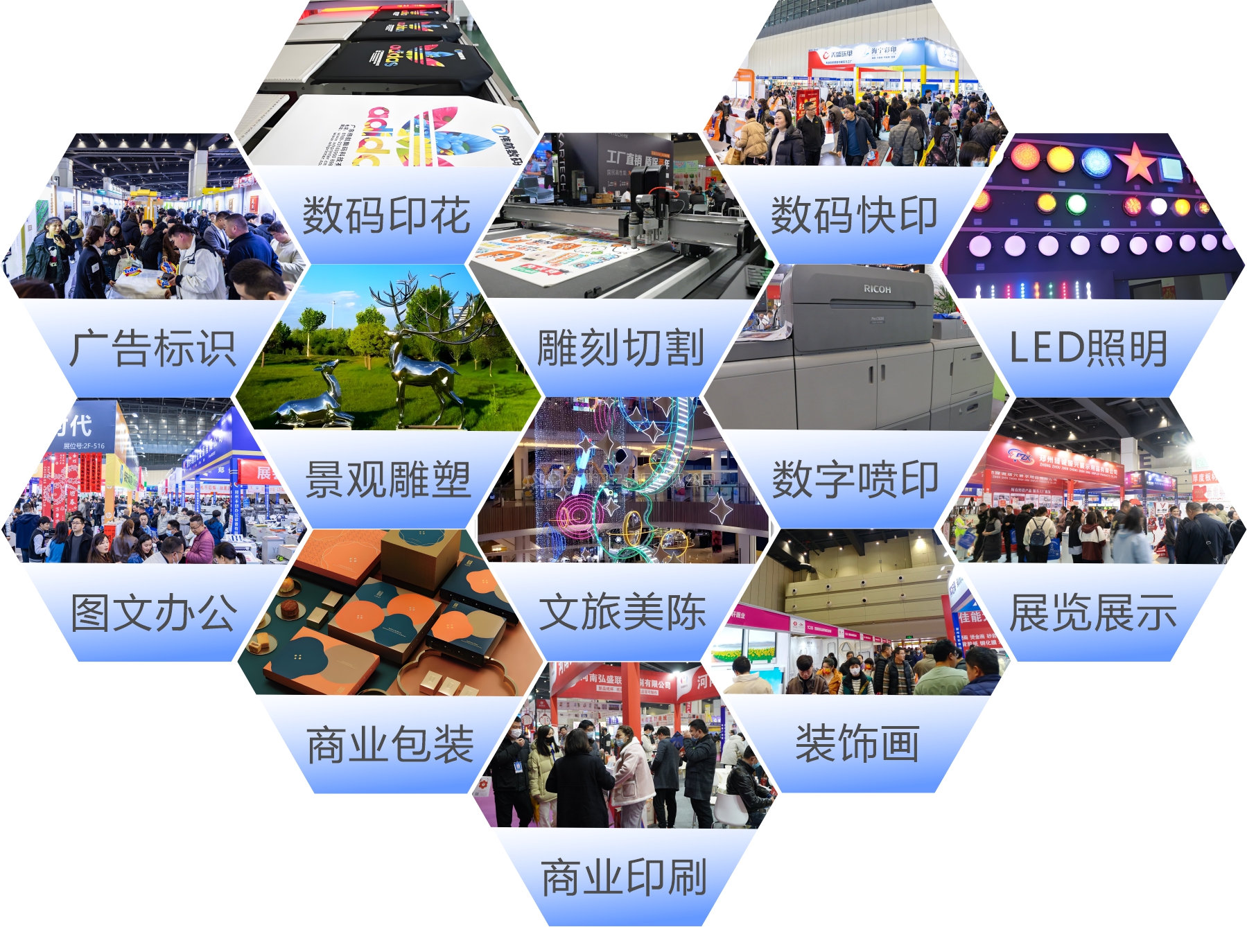 展会展品范围涵盖了广告标识、LED照明、喷印、印花、雕刻切割、图文办公、商业印刷与包装、数码快印、影像、装饰画与框业,为众多品牌进入河南及中北部市场提供了机遇,更为河南及中北部市场带来了全球采购的绝佳平台。